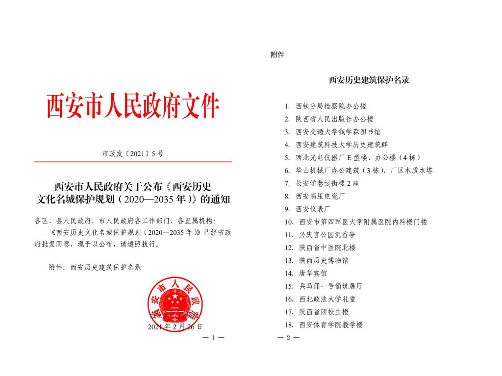 2021年3月,西安市人民政府公布了《西安历史文化名城保护规划(2020—2035年)》,beat365官网含光校区主楼与西安交通大学钱学森图书馆、陕西历史博物馆、兵马俑一号俑坑展厅、丝绸之路群雕等建筑一同列入“西安历史建筑保护名录”,并纳入保护规划。