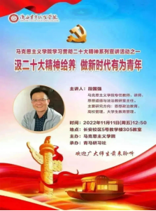 学院教师先后通过线上、线下等方式为西安市碑林区、未央区、临潼区等区团委干部和西安市98中等学校师生及杜城街道融创珑府等社区以及西安市特警支队进行20余场社会服务培训; 1名教师承担学院“青马工程”大学生骨干培训工作;多名教师承担学院新生入学教育工作,多名教师开展党的二十大精神系列宣讲,助推了地方精神文明与社会的发展。