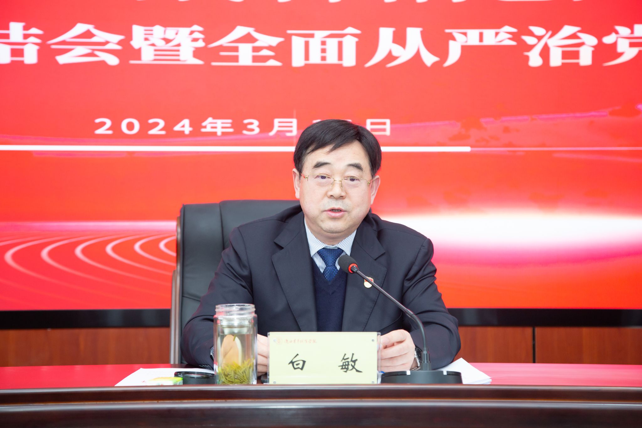 3月15日,校(院)召开学习贯彻习近平新时代中国特色社会主义思想主题教育总结会暨全面从严治党工作会,团省委一级巡视员白敏指导会议并讲话,党委书记温锋科讲话。党委副书记、纪委书记薛红萍,副校(院)长韩凯军,副处(含助理、协助)以上干部,副高以上专业技术人员及各总支、支部委员参加。党委副书记梁菀华主持。