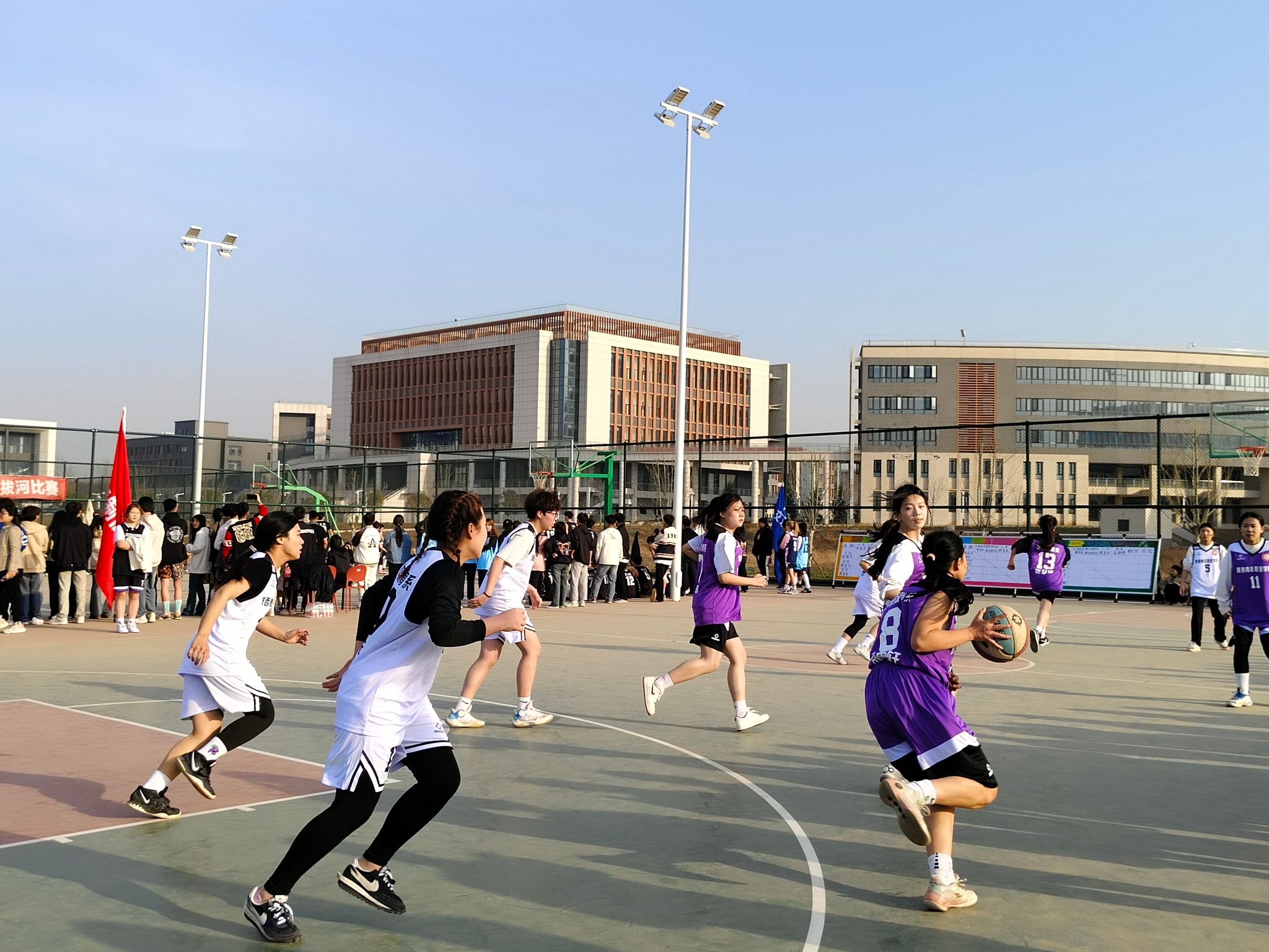 开幕赛上,双方球员果断进攻、快速抢断、灵活走位,传接配合默契,动作行云流水,展现出良好的团队协作和朝气蓬勃的精神风貌。精彩激烈的比赛赢得了现场观众奋力的呐喊声和加油声。