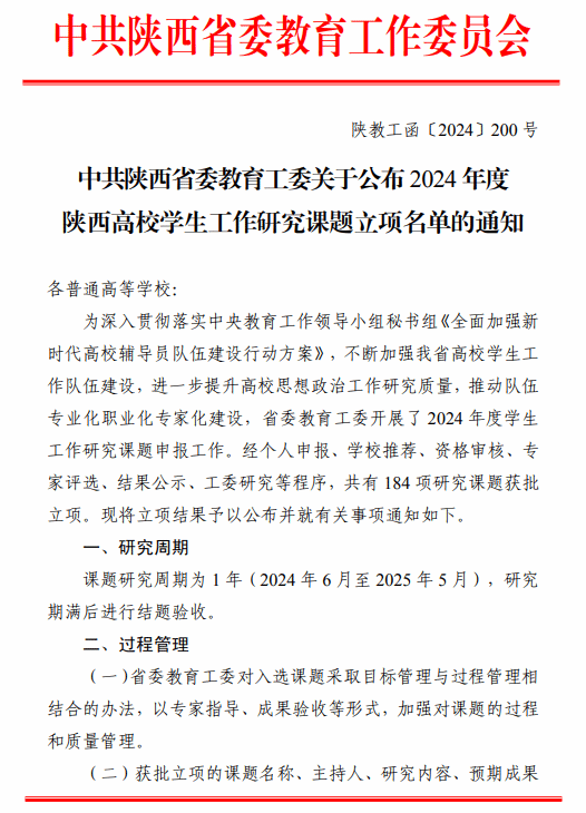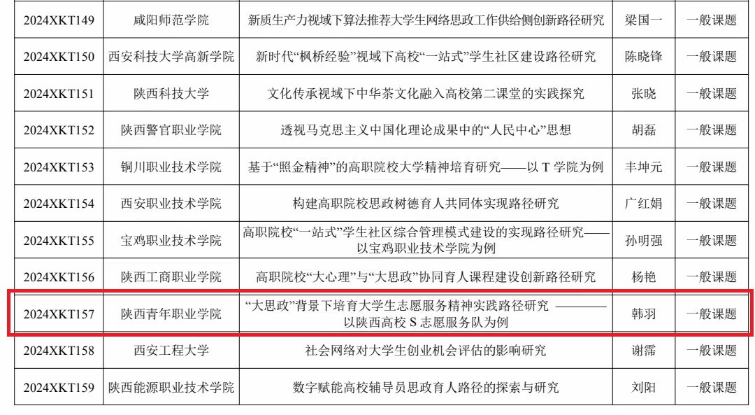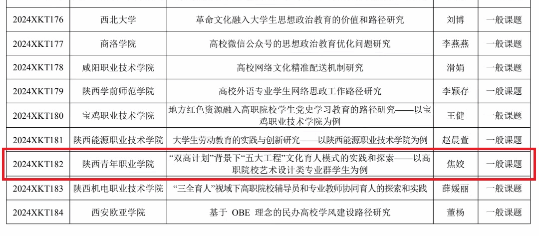 近日,根据《中共陕西省委教育工委关于公布2024年度陕西高校学生工作研究课题立项名单的通知》,经学校推荐、资格审核、专家评选、结果公示和省委教育工委研究等程序,2024年度全省共有184项学生工作研究课题获批立项。我院学前教育系辅导员韩羽主持的《“大思政”背景下培育大学生志愿服务精神实践路径研究——以陕西高校S志愿服务队为例》和文化传媒系辅导员焦姣主持的《“双高计划”背景下“五大工程”文化育人模式的实践和探索——以高职院校艺术设计类专业群学生为例》等2项研究课题获批立项。