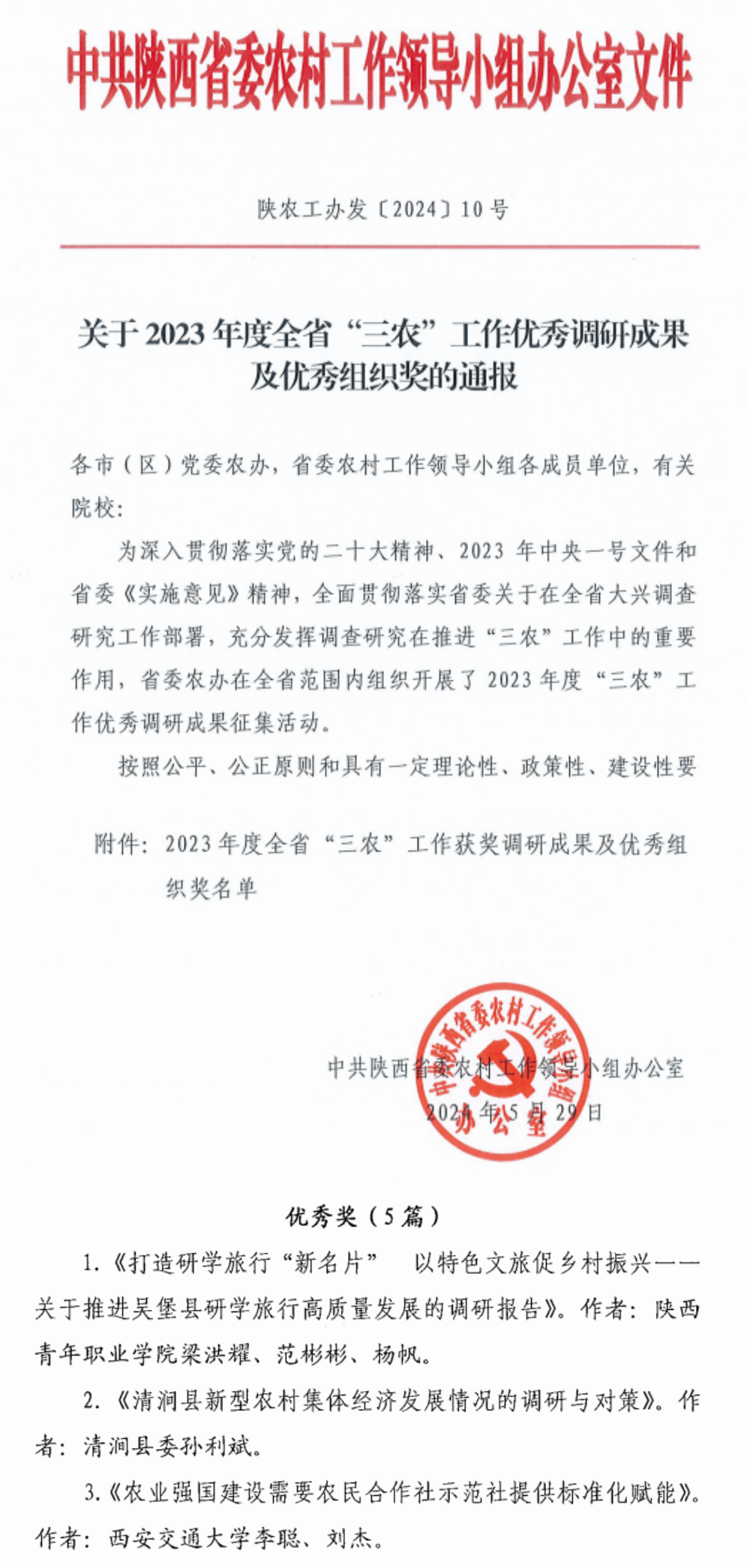 近日,中共陕西省委农村工作领导小组(省委实施乡村振兴战略领导小组)办公室印发《关于2023年度全省“三农”工作优秀调研成果及优秀组织奖的通报》,在省教育厅实施乡村振兴战略领导小组评选并择优推荐的基础上,省委农办在全省各委厅推荐的118篇调研成果中,经专家层层筛选、认真评审,共评选出一等奖6篇、二等奖 15 篇、三等奖 20篇、优秀奖5篇。其中,校(院)教师梁洪耀、范彬彬、杨帆等撰写的《打造研学旅行“新名片” 以特色文旅促乡村振兴--关于推进吴堡县研学旅行高质量发展的调研报告》荣获优秀奖。