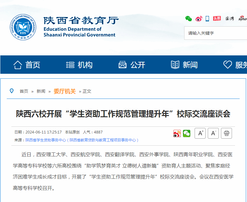 近日,陕西省教育厅官网以《陕西六校开展“学生资助工作规范管理提升年”校际交流座谈会》为题对我院发起并组织参与的资助育人活动进行了报道宣传。