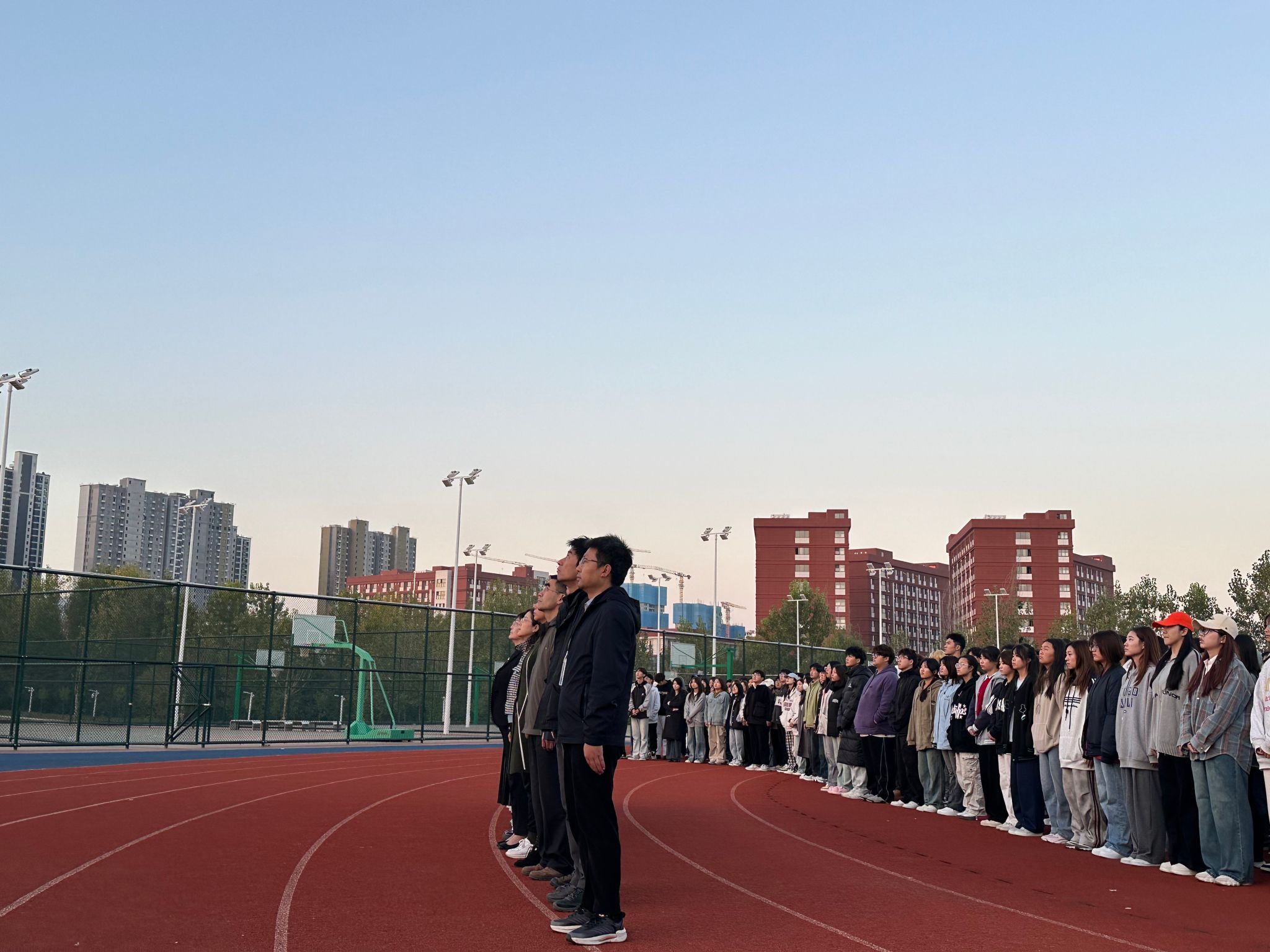迎着朝阳,国旗护卫队的19名队员迈着坚定的步伐护送五星红旗到达旗杆下。当庄严的国歌响起,全体人员肃立,目光紧紧跟随缓缓上升的国旗,伴随着国歌的每一个音符,国旗冉冉升起,迎风招展,现场每个人的心中都涌动着对祖国的无限热爱。