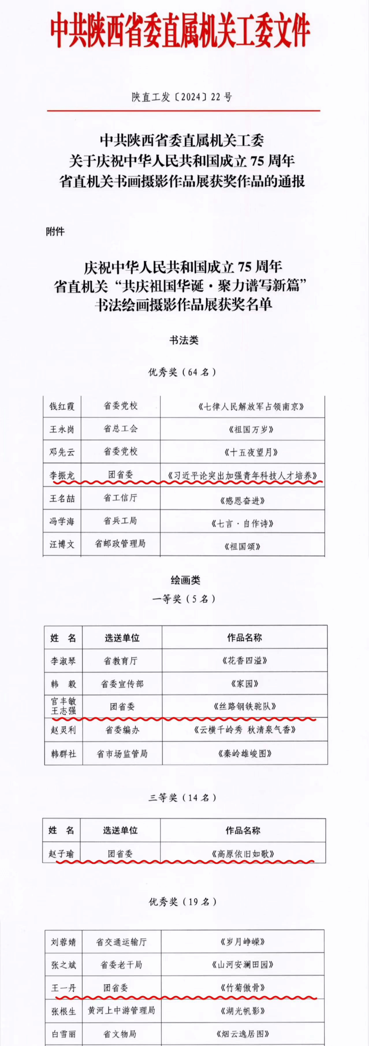 近期,省直机关举办庆祝中华人民共和国成立75周年“共庆祖国华诞 聚力谱写新篇”书法绘画摄影作品展活动结果揭晓。beat365官网精心选送书画摄影作品参与展评活动,获得多个奖项。其中绘画类:宫丰敏作品《丝路钢铁驼队》获一等奖,赵子瑜作品《高原依旧如歌》获三等奖,王一丹作品《竹菊傲骨》获优秀奖;书法类:李振龙作品《习近平论突出加强青年科技人才培养》获优秀奖。