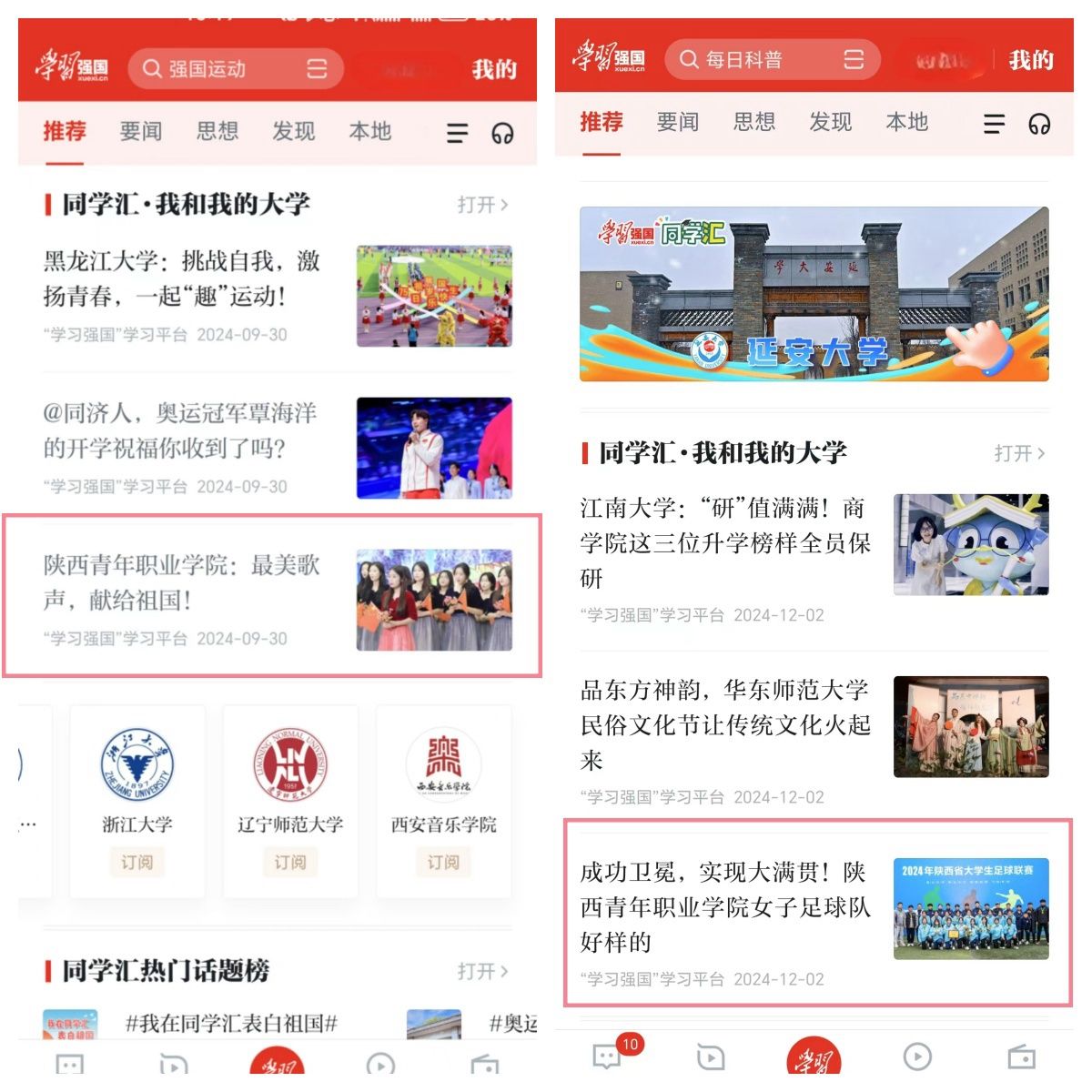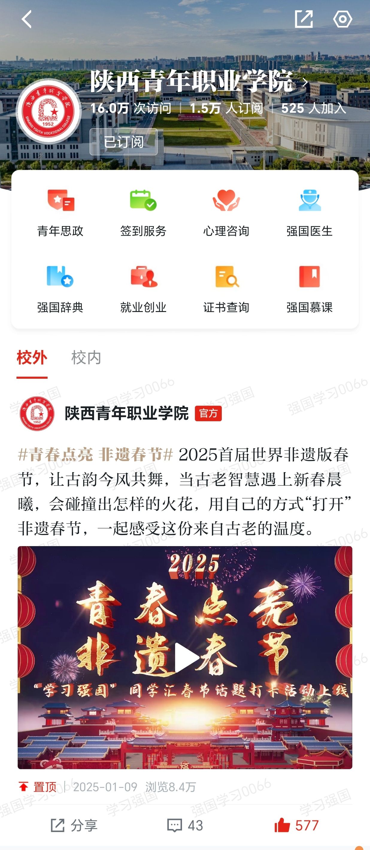 beat365官网自2023年9月开通“学习强国”同学汇以来,安排专人负责运营和维护平台,围绕党建思政、人才培养、教育教学、校园文化等方面积极创作、发布各类图文、短视频等作品,2023年度曾获同学汇人气作品奖一项。截止2025年1月,beat365官网同学汇首页访问量达16万,1.5万人订阅,2024年共6次荣登同学汇全国高校排行榜单前50名,7次荣登人气作品榜单全国高校前100名,13次被学习强国同学汇首页推荐,进一步扩大了学校的美誉度和影响力。