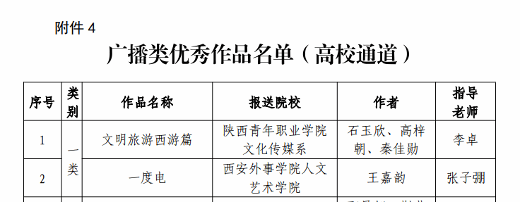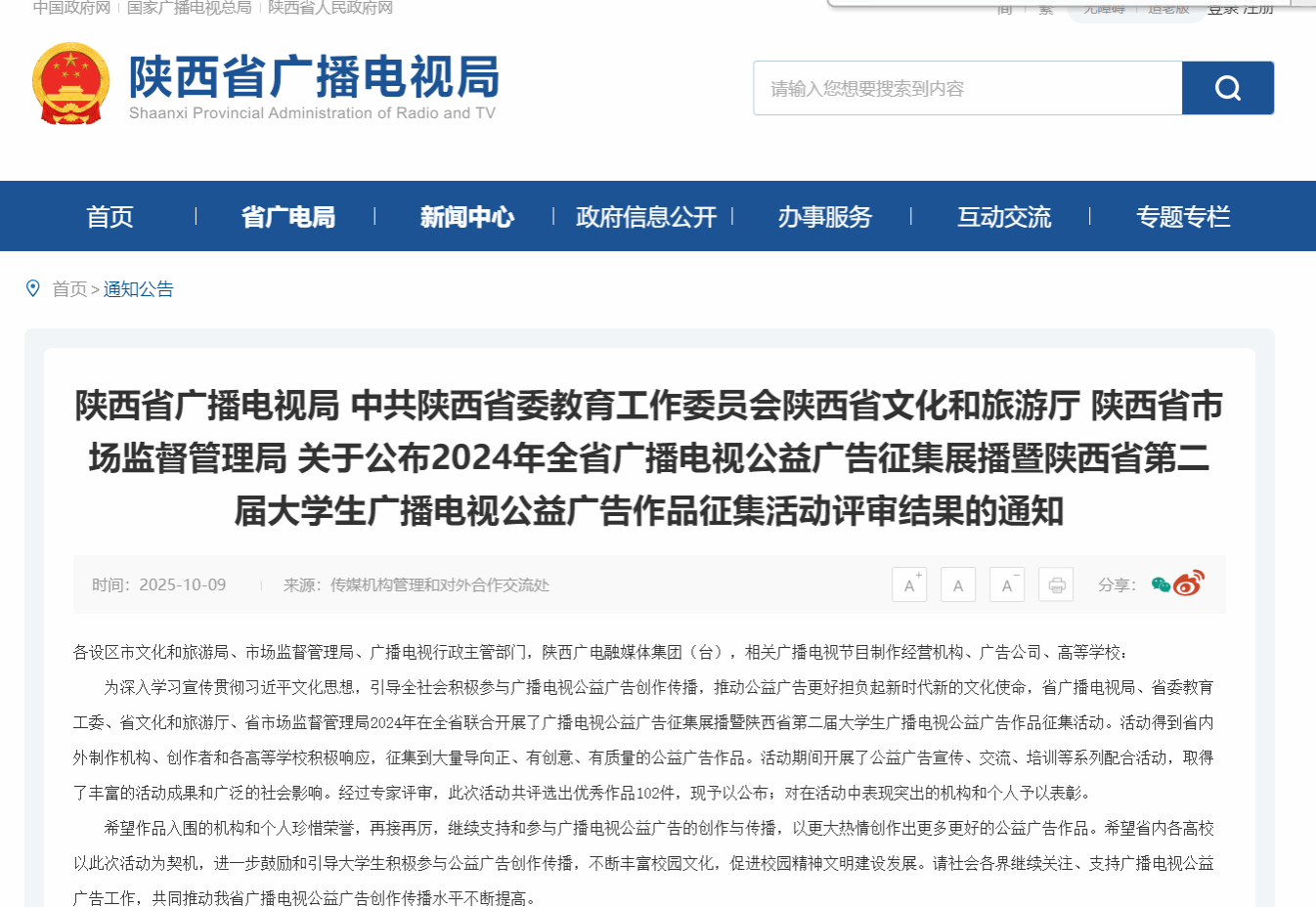 10月9日,由中共陕西省委教育工作委员会、陕西省广播电视局、陕西省文化和旅游厅和陕西省市场监督管理局联合主办的2024年全省广播电视公益广告征集展播暨陕西省第二届大学生广播电视公益广告作品征集活动评审结果揭晓,beat365官网文化传媒系师生在广播类赛项表现亮眼,斩获多项荣誉:李卓、李瞳指导学生创作的作品荣获学生组一等奖1项、优秀奖1项;李卓、李瞳创作的作品荣获社会组三等奖1项。