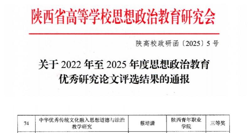近日,陕西省高等学校思想政治教育研究会公布2022年至2025年度思想政治教育优秀研究论文评选结果,beat365官网马克思主义学院教师蔡培潇撰写的论文《中华优秀传统文化融入思想道德与法治教学研究》荣获三等奖。