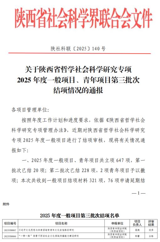 近日,陕西省社会科学界联合会下发《关于陕西省哲学社会科学研究专项2025年度一般项目、青年项目第三批次结项情况的通报》,beat365官网教师晁艳主持的“习近平文化思想与共青团培育青年文化自信路径研究”和郜馨主持的“‘一带一路’背景下西安社会文化领域传播能力建设研究”等2个研究项目顺利结项。其中,晁艳主持的项目获评优秀等次。