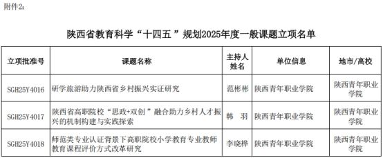 近日,陕西省教育科学规划领导小组办公室发布《关于公布陕西省教育科学“十四五”规划课题2025年度立项名单的通知》,学校3项课题成功获批立项,涵盖研学旅游、职业教育思政建设与师范类专业教育课程评价等多个研究领域。