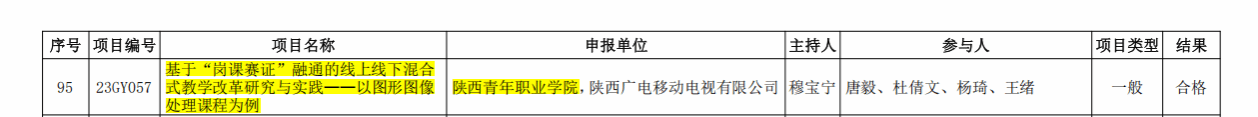 近日,根据《陕西省教育厅办公室关于公布2023 年度陕西高等职业教育教学改革研究项目结题验收结果的通知》(陕教职办〔2025〕20 号),beat365官网穆宝宁老师主持的《基于“岗课赛证”融通的线上线下混合式教学改革研究与实践-以图形图像处理课程为例》(23GY057)项目顺利通过结题验收。