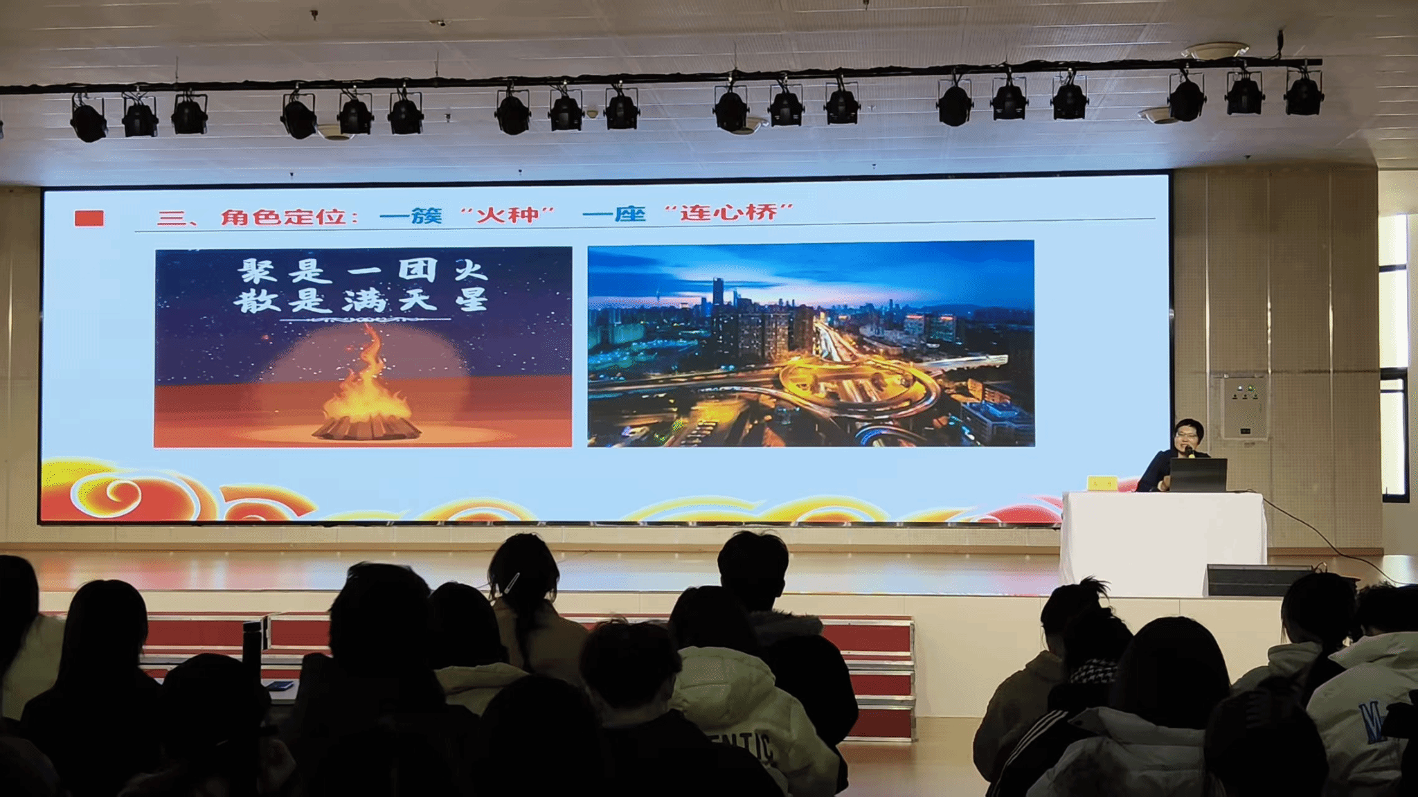 马月聚焦团学骨干常遇的学习与工作失衡、工作沟通受阻、自我价值感动摇、团队凝聚力不强等四大问题,精准给出破解方案:要做“规划师”而非“救火员”,提前谋划、合理分工,实现学工两不误;要做“路由器”而非“单声道喇叭”,畅通上下沟通渠道,打破信息壁垒;要做“催化剂”而非“独行侠”,凝聚团队合力,激发集体活力;要做“蓄电池”持续充电,在学习实践中筑牢自我价值根基。