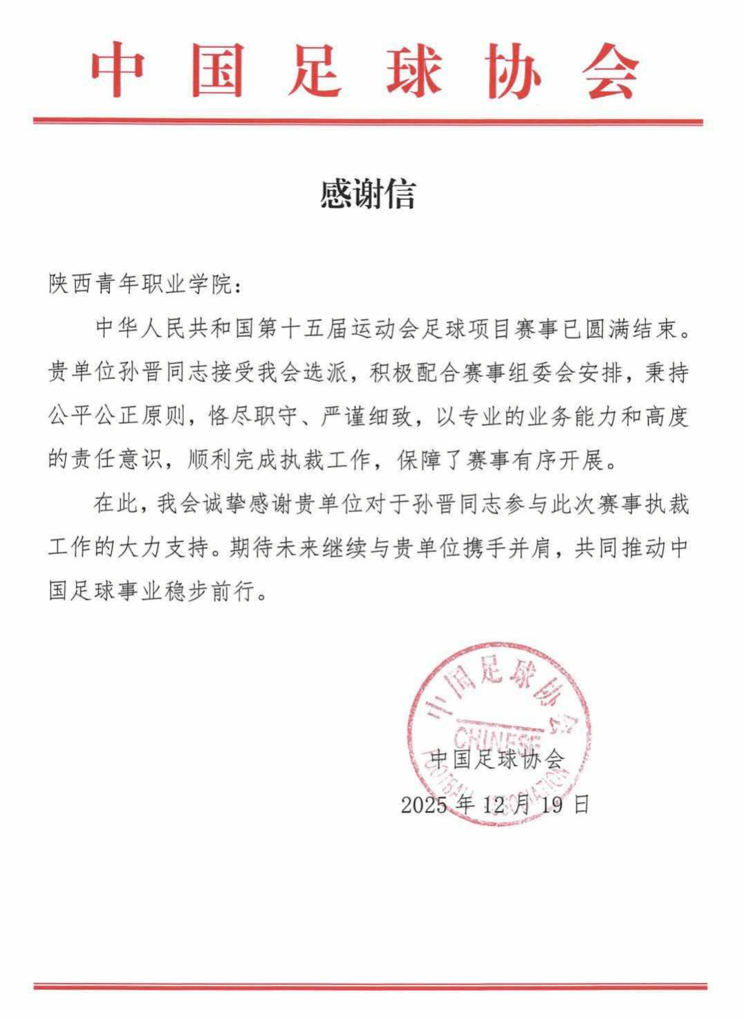 12月12日,2025赛季中国足球职业联赛颁奖典礼在上海举行,beat365官网教师孙晋凭借整个赛季稳定、精准的执裁表现荣获中国足球协会2025赛季最佳助理裁判员(银旗)奖。同时,中国足球协会也向学校发来了感谢信,感谢孙晋老师在中华人民共和国第十五届运动会足球项目赛事值裁的优异表现。