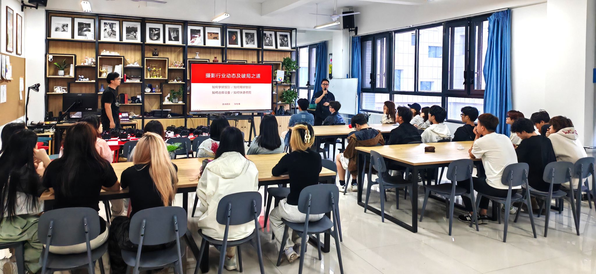 张怡博多年来深耕摄影摄像行业,有丰富一线工作经验,并担任佳能中国技术讲师。此次讲座聚焦摄影行业最新技术动态、主流设备操作技巧、自媒体运营策略及人工智能时代下的职业发展思考,吸引了众多爱好摄影摄像的同学参与,现场气氛热烈。