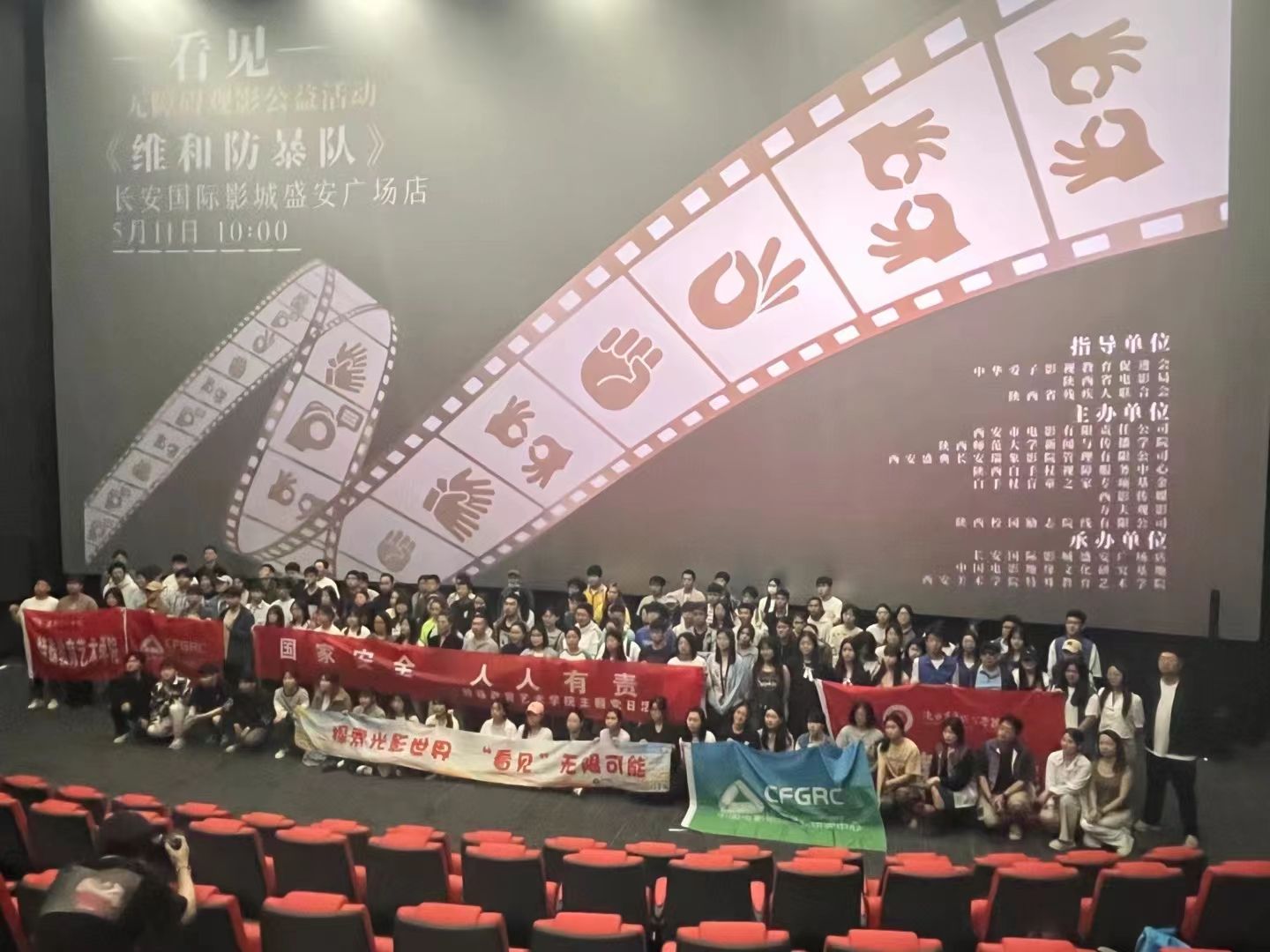 5月11日上午,继续教育学院学生志愿者服务队在专职班主任夏宇的带领下,前往西安市碑林区盛安广场长安国际影城,参加由省残联和省电影局指导,西安市电影公司、陕师大新闻传播学院、陕西白手杖残障服务中心主办的“看见”关爱残障人士无障碍观影公益活动的现场志愿服务活动。