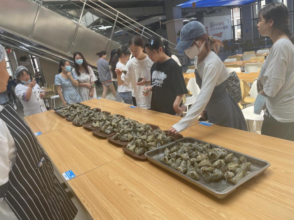 当天,餐厅LED屏幕滚动播放“粽情端午”、“端午安康”大字,为师生营造节日氛围。后勤服务管理中心安排餐厅一层晏煌餐饮公司和二层华胜餐饮公司免费发放2000余个粽籺供学生食用。校园松林超市为学生提供特价节日礼物,让学生感受节日喜悦。同学们纷纷表示:“虽然没有回家但是感受到了浓厚的佳节气氛,在学校过端午节很开心,很有纪念意义。”