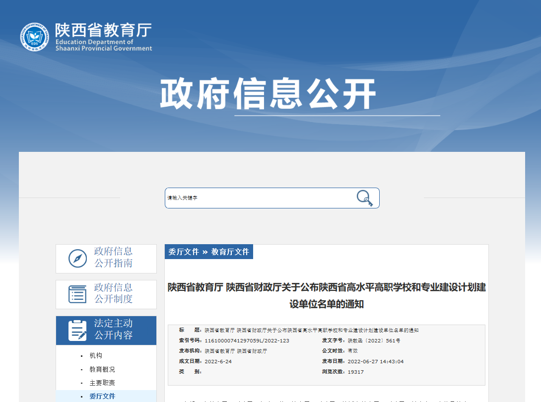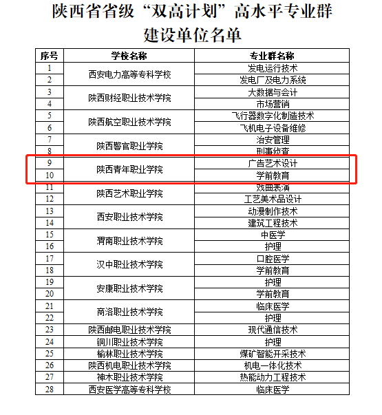 近日,省教育厅、省财政厅印发了《关于公布陕西省高水平高职学校和专业建设计划建设单位名单的通知》,校院成功入选陕西省“双高计划”高水平专业群建设单位,广告艺术设计、学前教育两个专业群获批省级高水平专业群建设项目。