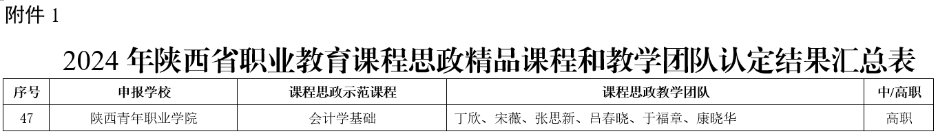 日前,陕西省教育厅办公室公布了《陕西省教育厅办公室关于2024年陕西省职业教育课程思政精品项目认定结果的通知》,数字经济与数字技术系教师丁欣讲授的会计学基础课程入选陕西省职业教育课程思政精品项目,教学团队被认定为省级课程思政教学团队。