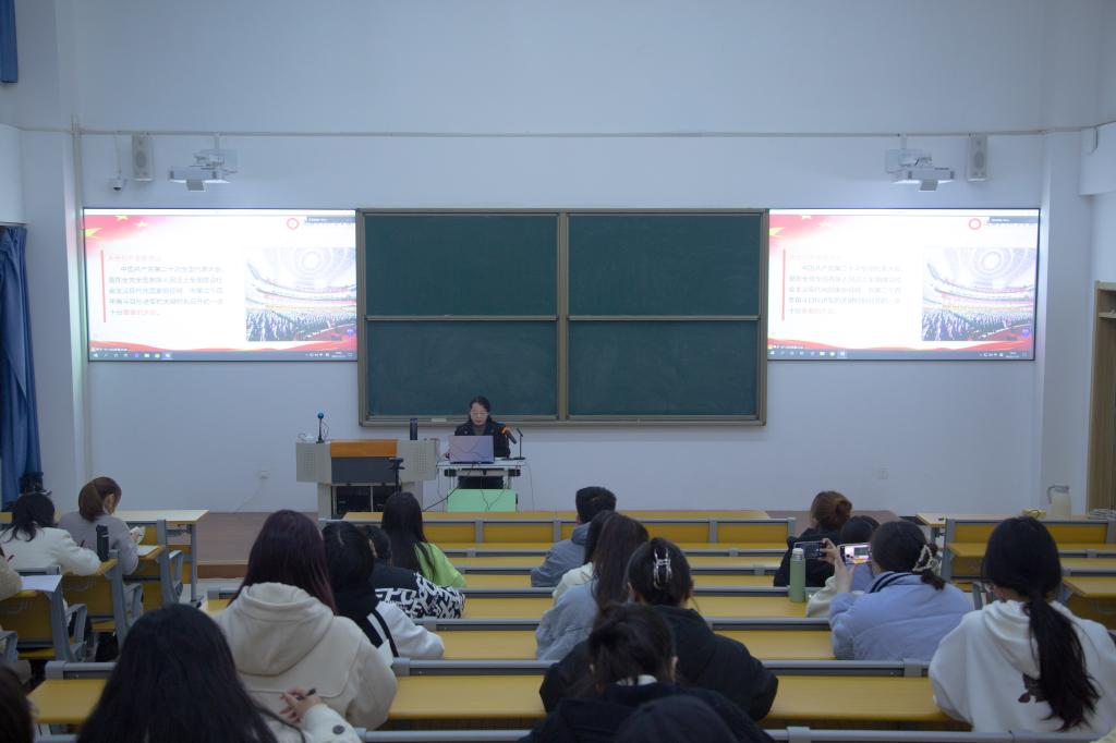 马雅玲作题为《学习领会党的二十大精神奋力谱写新时代中国特色社会主义新篇章》的报告。报告中,马雅玲紧扣党的二十大报告原文,围绕党的二十大主题和主要成果、过去5年的工作和新时代10年的伟大变革、马克思主义中国化时代化、中国式现代化、全面建设社会主义现代化国家的目标任务、坚持党的全面领导和全面从严治党、应对风险挑战等七个方面,分别从报告要点解读、奋进新时代、贯彻新思想、擘画新蓝图、启航新征程等五个部分对党的二十大报告内容进行了全面系统的解读和阐释。宣讲报告内容全面、观点清晰,对校院广大师生全面准确把握党的二十大精神内涵具有重要的启发和引导作用。