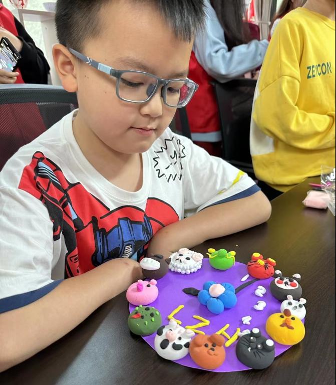 活动中,首先开展的《大风吹》《你画我猜》游戏,拉近了小朋友之间、小朋友和志愿者之间的距离,建立了良好的关系;随后,歌曲《我和我的祖国》、儿童舞蹈《哒啦滴哒啦》让小朋友们在音符和身体律动中学习才艺,增强展示能力;接下来,由小朋友和志愿者们共同协作完成的《生肖钟表》手工作品,利用可塑性强的泡泡泥材料完成创作,充分发挥想象力和理解力,提高了小朋友们的动手能力和团队合作能力;活动最后孙珠琳为表现优秀的小朋友颁发了奖品,并为参与活动的所有小朋友们赠送了“六一”儿童节纪念品。