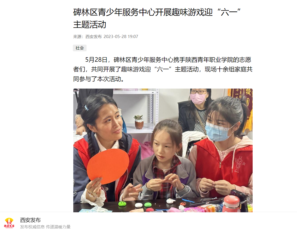 5月28日,学前教育系组织志愿者团队赴西安市碑林区青少年服务中心开展爱心公益活动,受到了西安晚报等媒体的关注和报道。