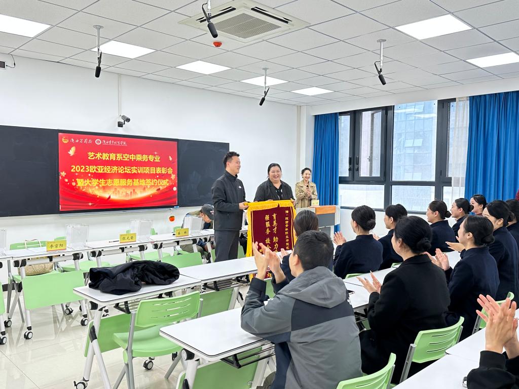 10月17日,艺术教育系举行空中乘务专业2023欧亚经济论坛实训项目表彰会暨大学生志愿服务基地签约仪式。西安会展中心高级服务总监张元荣、行政助理李宗阳,艺术教育系党总支书记、主任盛林,教学工作负责人宫丰敏,学生工作负责人鲍淼芳,空乘专业教研室主任杨洋、教师郑佳晨及2022、2023级空乘专业全体学生参加。