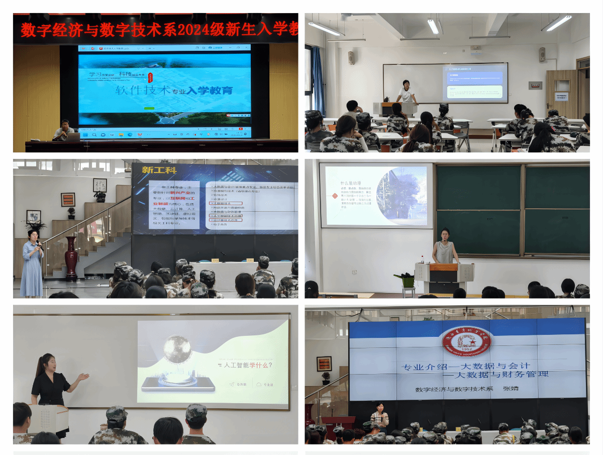 首先,数字经济与数字技术系学工团队分别以“奋力书写为中国式现代化挺膺担当的青春篇章”“育人为本 比赛为翼”“升本圆梦 助力成才”“奋斗是青春最靓丽的底色”“热血青年 强军报国”“阳光心理 健康人生”为题,从思想引领、竞赛育人、专升本、校园文体实践、应征入伍、心理健康教育等方面作育人主题分享,引导新生快速融入大学生活,科学树立发展目标,脚踏实地进步成长。王原向全体新生介绍了图书馆馆藏信息,普及了图书借阅流程和注意事项,鼓励同学们培养良好阅读习惯,提升综合素养。
