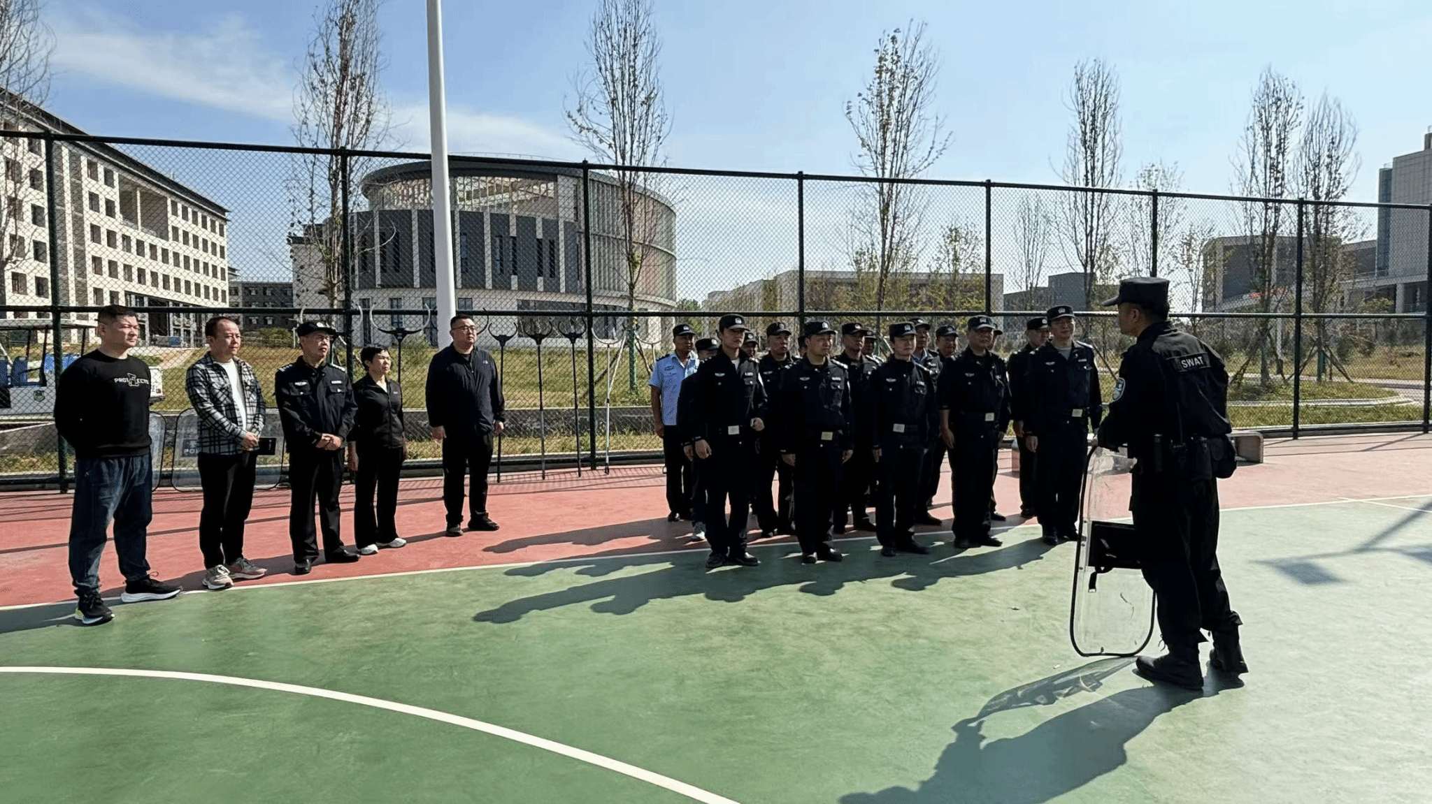 10月16日,保卫处联合杜曲派出所在长安校区操场组织开展2024年秋季反恐防暴培训与演练。驻校民警张建利、杜曲派出所副所长闫文、保卫处全体管理人员、杜曲派出所民警和校卫队员参加了此次培训。