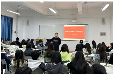 随后,学前教育系心理学专任教师卢杰为同学们做朋辈心理帮扶专题培训。在培训中,卢杰为学生讲解了大学生常见的人际交往问题,并开展了一次人际关系主题的团体心理辅导活动。同学们通过身体放松、大风吹等小游戏快速破冰,在分组团体活动中体验了如何进行有效沟通。卢杰老师授课幽默风趣、深入浅出,参与活动学生反响热烈,表示受益匪浅。