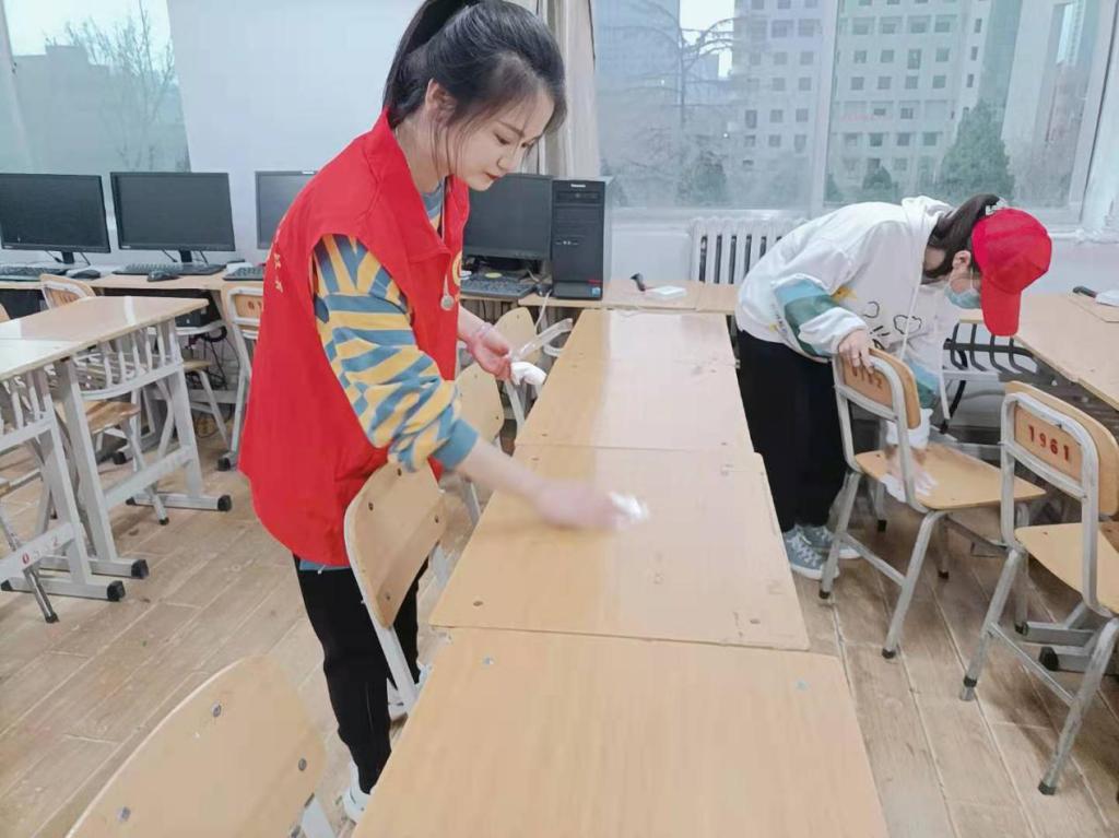 团学干部和志愿者们积极参与,分别前往教学楼、财经系会计实训室及各个教室,针对地面、桌面、门窗等进行了认真仔细的清洁消毒,帮助师生营造了整洁卫生的学习环境。
